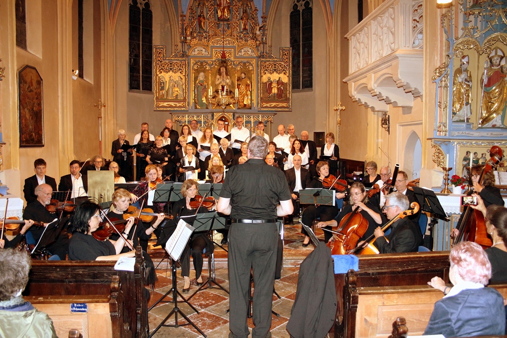 Die Musikschule mit Chor und seinen vier Solisten Verena Apfelböck (Sopran), Cornelia Klüter (Alt), Dr. Franz Krähschütz (Tenor) und Hans-Jürgen Bernhart (Bass) und das Streichorchester wurden von Barbara Wapler, Claudia Judex (beide Oboe), Dr. Peter Wapler (Fagott), Curovic Nicola, Robert Huber (beide Trompete) Rupert Balthin (Pauke) und Gabi Munz an der Orgel verstärkt. Auf dem Programm standen das Gloria in D (RV 589) von Vivaldi und die große Credo-Messe (KV 257) von Mozart.