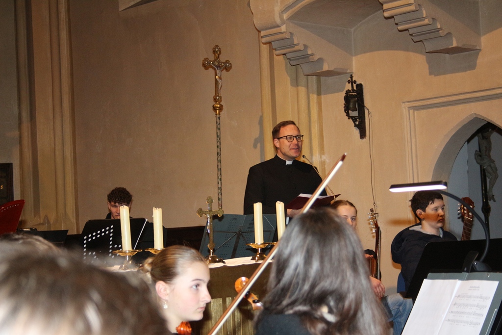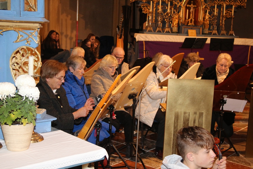 Von der Empore her schallte verhalten das gemischte Bläserensemble mit „Über allen Gipfeln ist Ruh“. Das ist die berühmte Anfangszeile von Goethes Gedicht „Wandrers Nachtlied“, das die tiefe, friedliche Stille der Natur am Abend beschreibt und eine tröstliche, fast übernatürliche Ruhe ausdrückt. Ganz zum Gegensächlichen „Go down Moses“ ein Gospel, das geschmeidig und schön klingt. Der Kinderchor mit der Singklasse von Leopold Gnedel kombinierte „Mit ihrem Herzen hat vernommen“, einer noch jungen Komposition mit dem spanischen Weihnachtslied „Gatatumba“. Volkstümliche alte Musikstücke thematisierte das Hackbrettduo mit der Aufzugsmusik aus Großmehring. Die bezieht sich auf historische Tanz- und Spielmusikstücke, die im frühen 19. Jahrhundert aus der Region um Großmehring überliefert wurden.  Dazu erklang das „Menuett aus Welschnofen“, ein volkstümlichen Liedgut zur Adventszeit. Unter der Leitung von Ulli Wiedmann-Feichtl boten die Geigenchaoten das „Weihnachtsmenuett“ und das traditionelle klangvolle katalanische Weihnachtslied „El Noi de la Mare“. Die klassischen Barockmelodie von Purcelli „Rigaudon“ und das deutsche Weihnachtslied „Advent ist ein Leuchten“ interpretierte das Veehharfenensemble. Ebenfalls mit Wiedmann-Feichtl erklangen die Violinen von dem Emertshamer Geigenensemble mit dem „Krippeng`sangl“ und dem „Pifa“. Sehr altes Liedgut interpretierte das Flötentrio mit Annemarie Bayerl, die das „Allemando Nr. 10“ von Peter Hueber aus dem frühen 19. Jahrhundert überarbeitet hat. Auch das „Allegretto Nr. 6“ stammt aus dieser frühen Zeit, das die Flötistinnen zum Besten gaben. Dem einfachen Liedgut widmete sich das Kienberger Gitarrentrio. Mit „Leise rieselt der Schnee“ setzen sie Hoffnungen auf weiße Weihnachten. Der Tonfall des alten Stückes „Vom Himmel hoch, o Engel, kommt“ aus dem Jahr 1623 ist ein jauchendes Halleluja auf Gitarrensaiten. Ebenfalls auf Saiten, aber mit einer Harfe ließ Alexandra Scheufler die „Prelude mit Parita“ erklingen , bevor zum Ende hin Helmut Jahn mit Thomas Eberl als Akkordeonduo „Eröffnet die Pforten“ und die „Andachtsweis“ den musikalischen Adventsreigen abschlossen. Zwischendurch erzählte Pfarrer Brüderl kleine Weihnachtsgeschichten zum Schmunzeln oder Nachdenkliches zur Adventszeit. Gemeinsam, Instrumentalisten und Konzertbesucher, schlossen die musikalische Stunde gemeinsam mit dem Andachtsjodler ab. Es war ein schönes Konzert, wo die jungen bis älteren Instrumentalisten ihr Können beweisen konnten und so die Sing- und Musikschule Emertsham bestens präsentierten. Für die Zuhörer in der vollen St.-Vitus Kirchen war es nicht nur ein besinnlicher Ohrenschmaus, wie im Nachgang zu hören war, sondern auch ein wenig Runterkommen vom hektischen Alltag hin zur besinnlichen Weihnachtszeit.